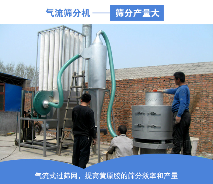 氣流篩分機采用的流通的氣流作為篩分的主要承載動氣,在進行篩分的時候?qū)ⅫS原膠充分的擴散在氣流中,通過氣流的流動,使黃原膠通過篩網(wǎng),有效解決篩分中出現(xiàn)篩網(wǎng)堵孔等問題,提高了篩分效率,同時可以與風(fēng)機并網(wǎng)配套使用,搭配脈沖除塵器,24小時不間斷運作,篩分效率可達到95%以上,產(chǎn)量高可以達到每小時10噸,是篩分的2-5倍。