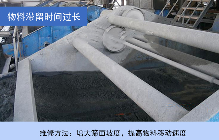 礦石在篩網(wǎng)上移動慢,礦石移動速度過慢,導致篩面上積礦過多,使圓振篩總是在超負荷的狀態(tài)下運行,從而導致篩網(wǎng)破損快,撓性聯(lián)軸器撕裂、彈簧損壞、大梁斷裂、箱體開裂等一系列故障。