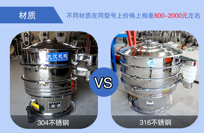 皂粉旋振篩材質(zhì)上可分為304不銹鋼與316不銹鋼,不同材質(zhì)在同型號(hào)上價(jià)格上相差800-2000元左右。皂粉旋振篩在結(jié)構(gòu)材質(zhì)上可分為全不銹鋼材質(zhì)(整機(jī)不銹鋼材質(zhì))和不銹鋼+碳鋼材質(zhì)(與物料部位為不銹鋼材質(zhì),底座為碳鋼材質(zhì))兩種??筛鶕?jù)不同的篩分使用環(huán)境來(lái)選擇不同的結(jié)構(gòu)材質(zhì)。