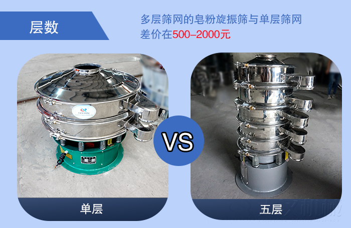 皂粉旋振篩可安裝1-5層篩網(wǎng),同時(shí)進(jìn)行2~6個(gè)等級(jí)的皂粉篩分、過(guò)濾、分級(jí)、除雜,可根據(jù)不同的篩分需求安裝不同層數(shù)的篩網(wǎng),安裝多層篩網(wǎng)的皂粉旋振篩肯定會(huì)比單層篩網(wǎng)的要貴一些,他們的差價(jià)在500-2000元左右。具體的層數(shù)選擇就是要根據(jù)您的篩分目的來(lái)決定。