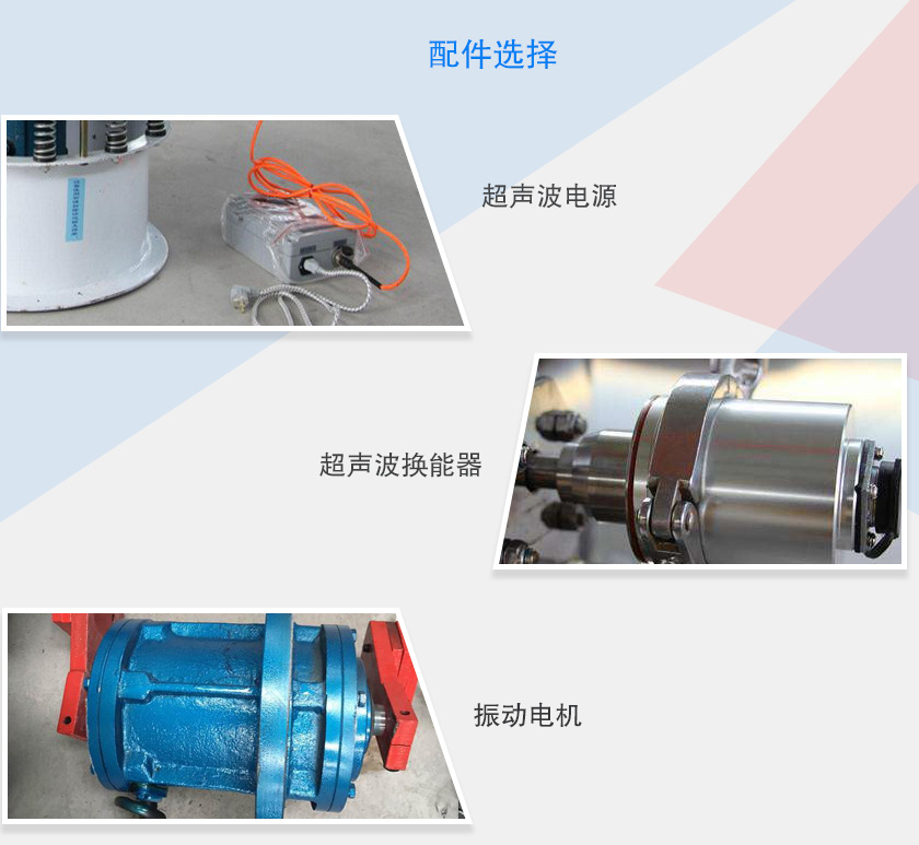 超聲波振動(dòng)篩主要配件有:超聲波電源、超聲波換能器、振動(dòng)電機(jī)。選擇不同質(zhì)量或種類的配件對于超聲波振動(dòng)篩使用效果都有著十分重要的作用。舉例來說,大漢超聲波振動(dòng)篩的電機(jī)可以選擇普通或者是防爆性能的電機(jī),防爆電機(jī)一般用于粉塵量大的場合,可以避免發(fā)生粉塵爆炸,其價(jià)格會比普通電機(jī)貴,一般篩分環(huán)境選擇旋振普通電機(jī)即可。