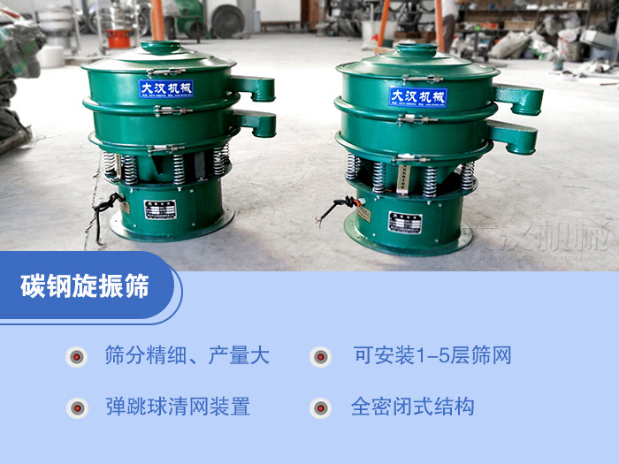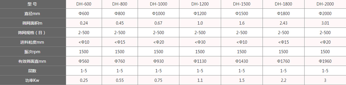 碳鋼旋振篩型號有:DH-400mm、DH-600mm、DH-800mm、DH-1000mm、DH-1200mm、DH-1500mm、DH-1800mm、DH-2000mm等八種標準型號。