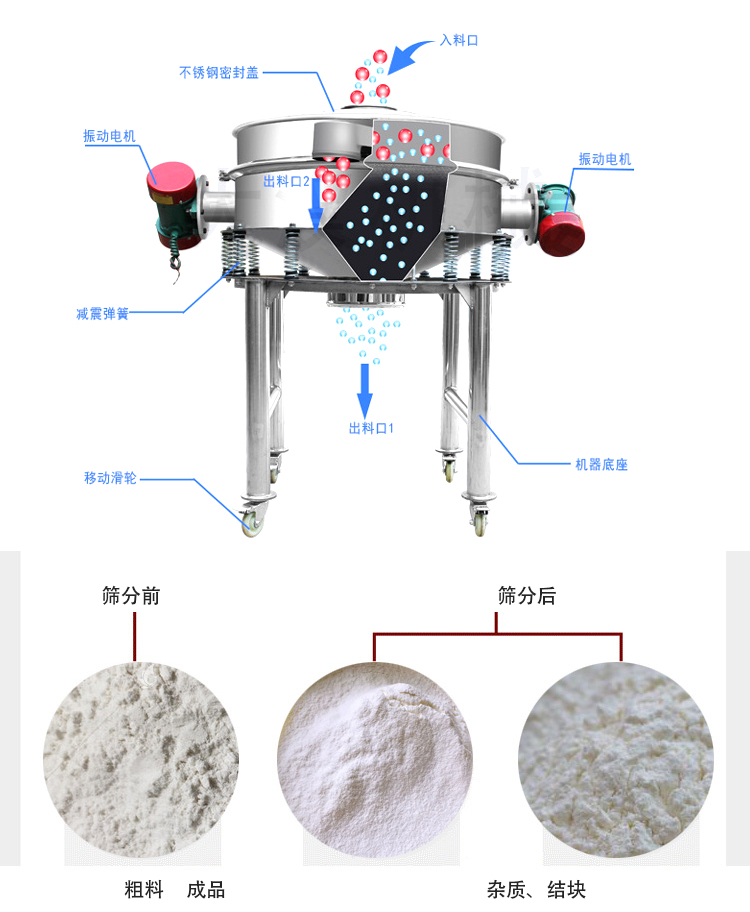 直排篩多用于面粉、淀粉、洗衣粉、金屬粉、添加劑、化工、非礦等行業(yè)的顆粒粉末的粗略篩分